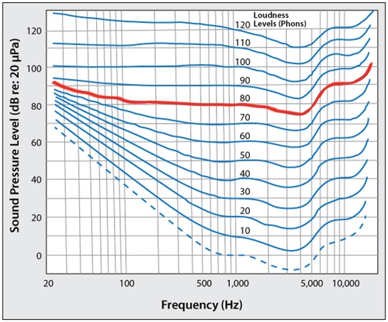 ลองมาดูในเส้นสีฟ้าแต่ละเส้น จะเห็นว่าcurveของเส้นสีฟ้าจะสูงในความถี่ต่ำ แสดงถึงว่าถ้าอยากให้คนรับรู้ความดังเท่ากับในความถี่สูง ระดับความถี่ต่ำจะต้องมีSPLที่สูงขึ้น มาลองดูตัวอย่างที่เส้นสีแดงที่มีความดัง 80dBตรงความถี่ 1,000Hz ลองไล่มาดูตรง 30Hzจะเห็นได้ว่าต้องใช้SPLสูงขึ้นมาเป็น 90dBถึงจะมีความรู้สึกถึงความดังเท่ากับตรง 1,000Hz ดังนั้นเราจึงเห็นคนปรับเสียงหรือคนฟังชอบที่จะปรับให้Volumeของเบสมีค่าสูงกว่าความถี่กลางหรือความถี่สูง รวมถึงการทำEQ curveแบบต่างๆก็มักจะยึดหลักที่มีcurveด้านความถี่ต่ำยกขึ้นสูงกว่าความถี่อื่นๆ และด้วยเหตุผลนี้จึงเป็นที่มาว่าทำไมreference levelของ Low Frequency channelถึงมีความดังมากกว่าmain channelsอยู่ 10dB